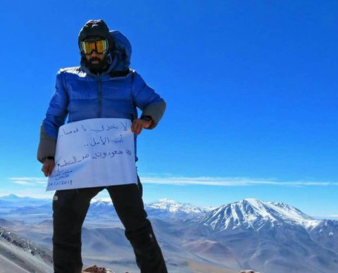 من ارتفاع أكثر من 6890 متر فوق سطح البحر، وقف الرحالة السعودي سعود العيدي، شامخًا بالشعار الذي رفعه من أعلى قمم العالم في جبال الأنديز في الأرجنتين "لا تحزني يا قدسنا أنتِ الأمل".