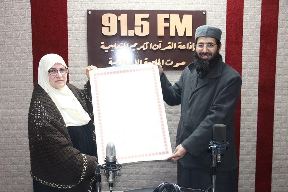 ومنح الشيخ هاني العلي مقدم برنامج "إتقان السند" الذي يبث عبر إذاعة القرآن الكريم التعليمية في غزة، الستينيّة الغندور إجازةً في السند المتصل عُقب استماعه المتكرر إلى قراءتها عبر برنامج الإذاعة.
