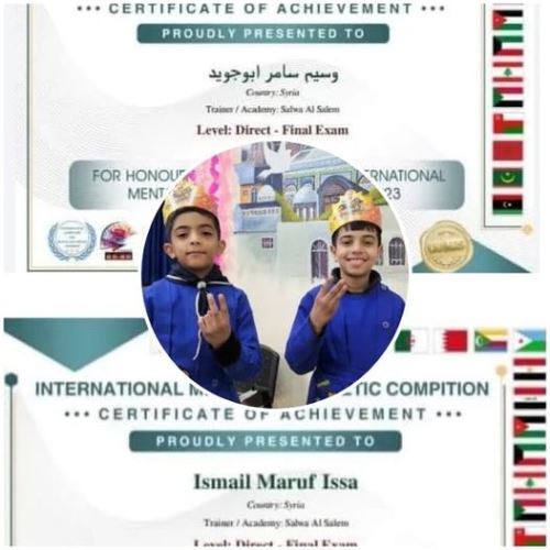 تمكّن الطالبان الفلسطينيان وسيم سامر أبو جويد واسماعيل مرهف عيسى من الفوز في المسابقة الدولية العالمية للحساب الذهني التي نظمتها مؤسسة UNMAS برعاية الأكاديمية البريطانية وبالتنسيق مع الأكاديمية الماليزية.