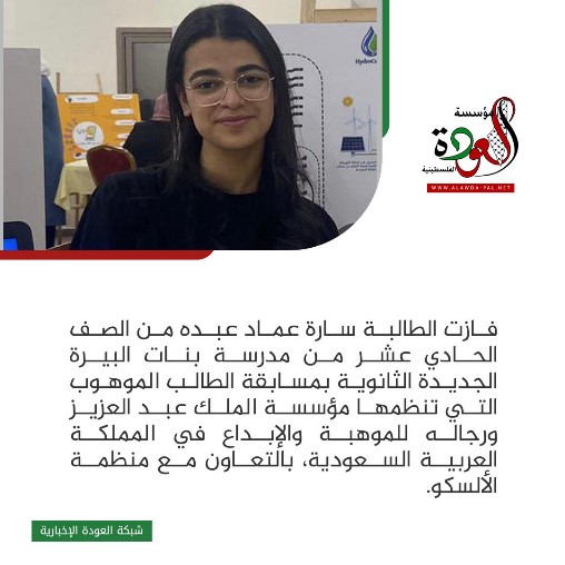 فازت الطالبة سارة عماد عبده من الصف الحادي عشر من مدرسة بنات البيرة الجديدة الثانوية بمسابقة الطالب الموهوب التي تنظمها مؤسسة الملك عبد العزيز ورجاله للموهبة والإبداع في المملكة العربية السعودية، بالتعاون مع المنظمة العربية للتربية والثقافة والعلوم "الألكسو".