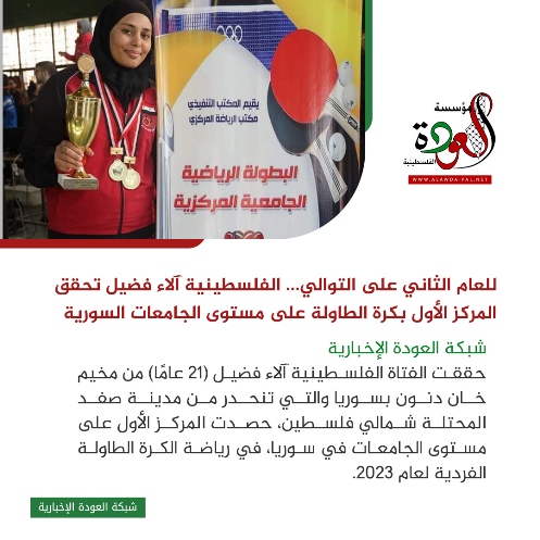 حققت الفتاة الفلسطينية آلاء فضيل (21 عامًا) من مخيم خان دنون بسوريا والتي تنحدر من مدينة صفد المحتلة شمالي فلسطين، حصدت المركز الأول على مستوى الجامعات في سوريا، في رياضة الكرة الطاولة الفردية لعام 2023.