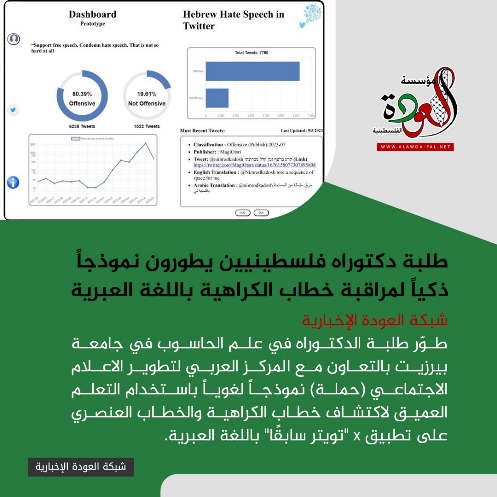 طلبة دكتوراه فلسطينيين يطورون نموذجاً ذكياً لمراقبة خطاب الكراهية باللغة العبرية