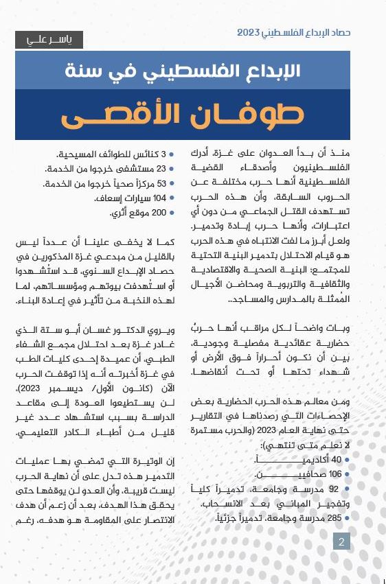 كما لا يخفى علينا أن عدداً ليس بالقليل من مبدعي غزة المذكورين في حصاد الإبداع السنوي، قد استُشهدوا أو استُهدفت بيوتهم ومؤسساتهم، لما لهذه النخبة من تأثير في إعادة البناء.