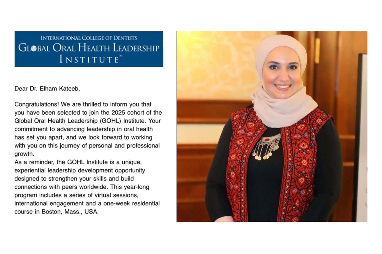 اختارت الكلية الدولية لأطباء الأسنان طبيبة الأسنان الفلسطينية د. إلهام الخطيب للانضمام إلى برنامج القيادة العالمية لصحة الفم (GOHL) لعام 2025.