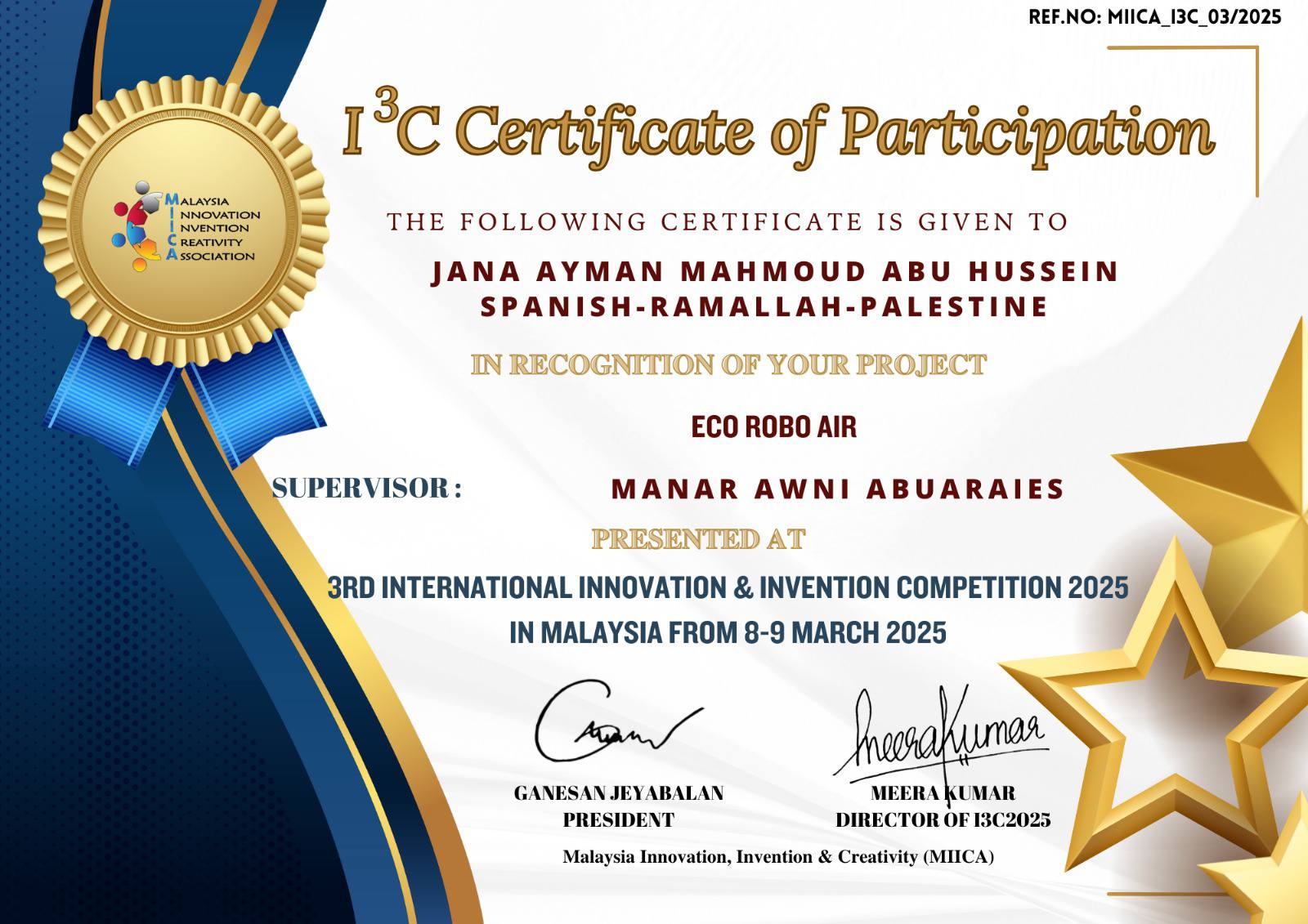 حققت مدرسة الإسبانية الأساسية العليا المختلطة في مديرية تربية رام الله والبيرة إنجازاً فلسطينياً متميزاً بحصولها على الجائزة الذهبية في المسابقة الدولية للتكنولوجيا والروبوت International Innovation & Invention Competition - IC2025 في ماليزيا.