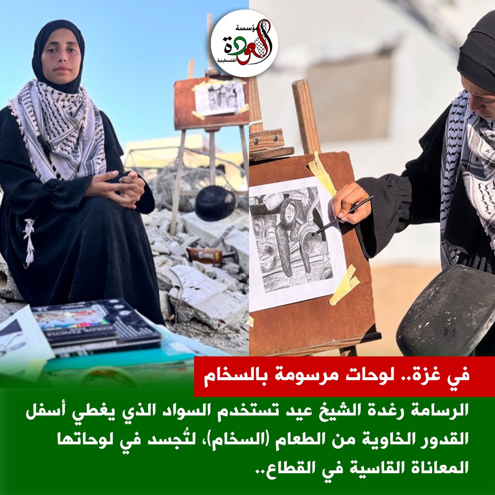 في مشهد يُلخّص الوجع الفلسطيني بكثير من الصمت والفنّ، تستخدم الفنانة التشكيلية الفلسطينية رغدة الشيخ عيد السواد المتراكم أسفل القدور الفارغة، كأداة رسم تنقل من خلالها قصة الجوع والصمود في قطاع غزة.