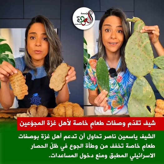 دجاج نباتي من طحين وماء، فاصوليا من الصبار... تحاول الشيف الأردنية "ياسمين ناصر" من خلال موهبتها في الطبخ أن تدعم أهل غزة بوصفات طعامٍ خاصة تخفف من وطأة الجوع في ظلّ الحصار الاسرائيلي المطبق ومنع دخول المساعدات.