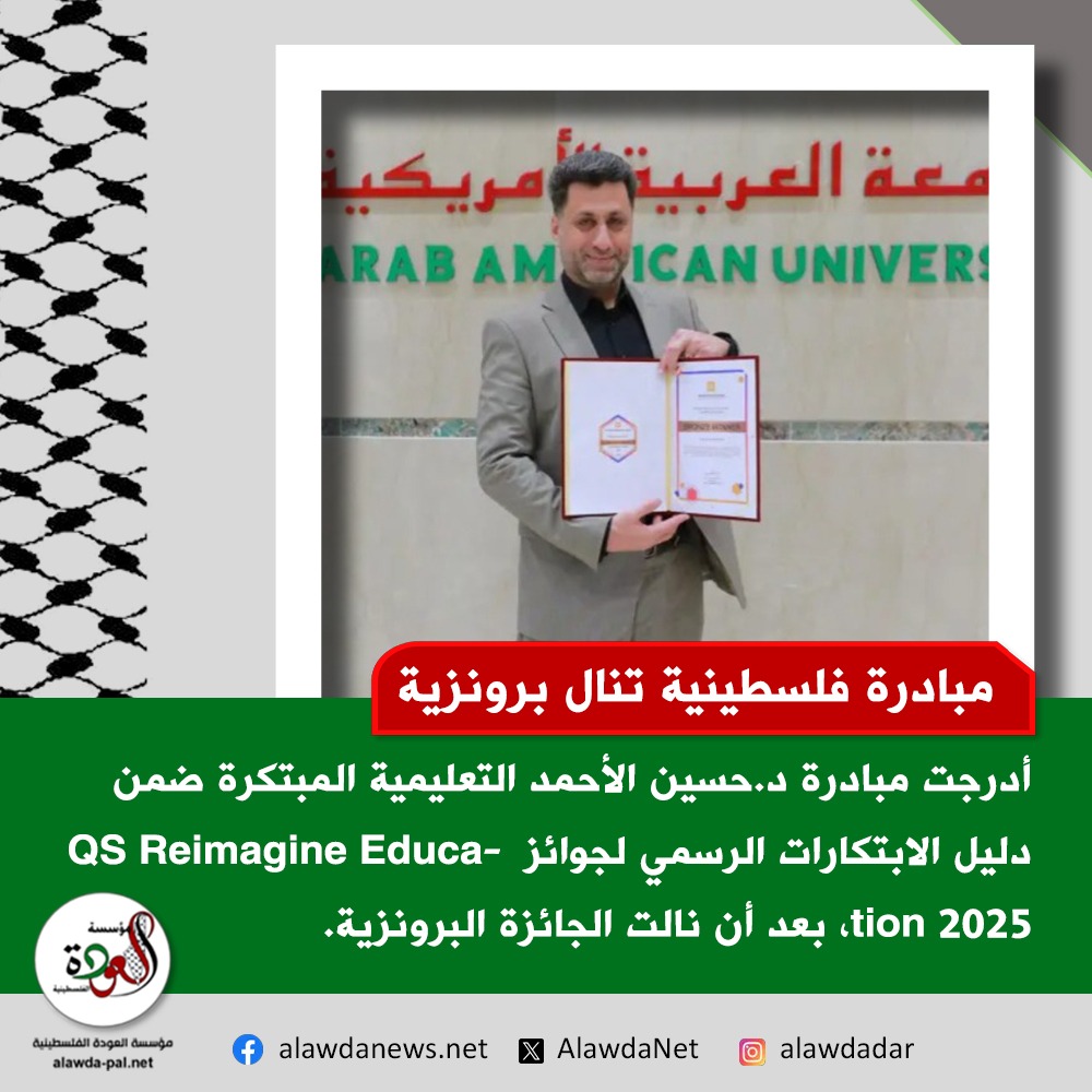 في إنجاز يرفع اسم فلسطين عالياً على خارطة الابتكار الأكاديمي العالمي، حقق الدكتور الفلسطيني حسين الأحمد إنجازاً رائداً بإدراج مبادرته التعليمية المبتكرة ضمن دليل الابتكارات الرسمي لجوائز QS Reimagine Education 2025، بعد أن نالت الجائزة البرونزية، مؤكداً أن الإبداع الفلسطيني قادر على المنافسة والتألق بين أبرز العقول التعليمية حول العالم.