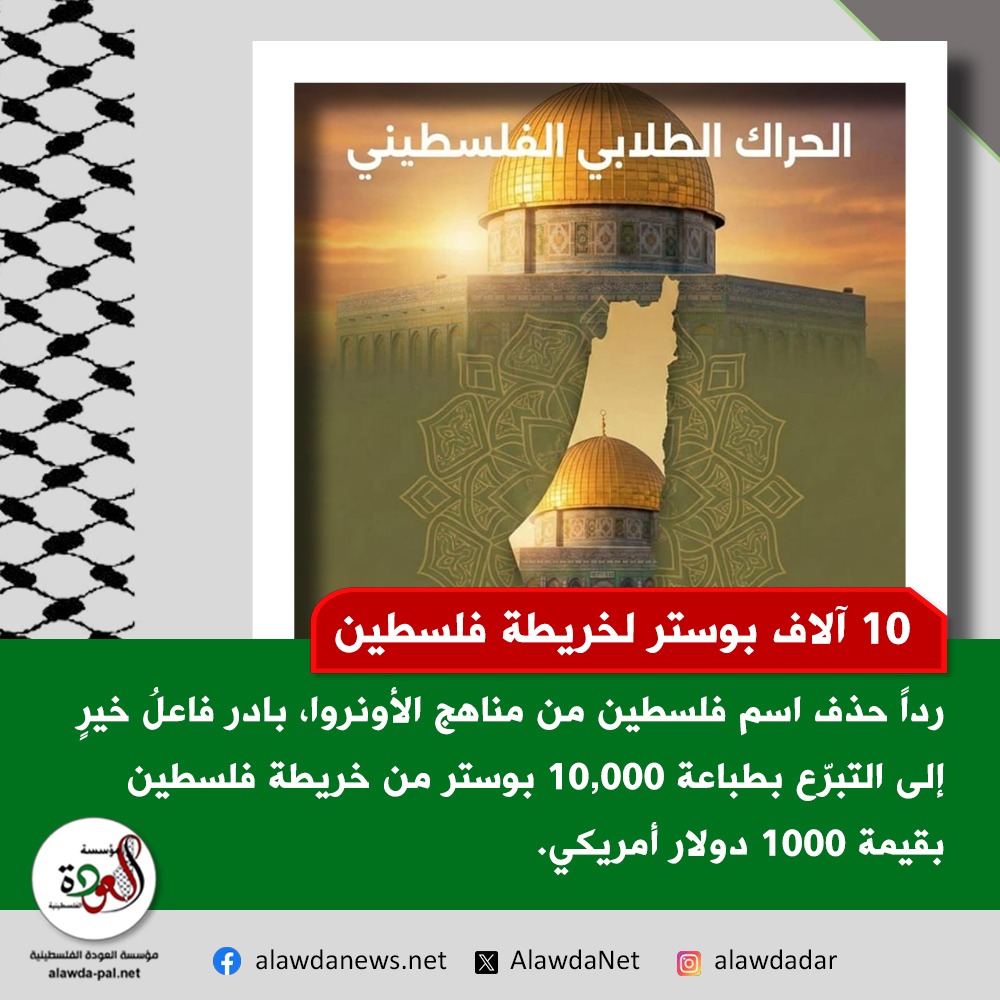 متابعةً لحالة الانحدار التي تشهدها وكالة غوث وتشغيل اللاجئين الفلسطينيين "الأونروا" في لبنان وما يرافقها من محاولات تمسّ الوعي والهوية الوطنية الفلسطينية بادر فاعلُ خيرٍ إلى التبرّع بطباعة 10,000 بوستر من خريطة فلسطين بقيمة 1000 دولار أمريكي جرى تخصيصها للتوزيع على طلاب مدارس الأونروا في مدينة صيدا ومخيم عين الحلوة ومخيم المية ومية.