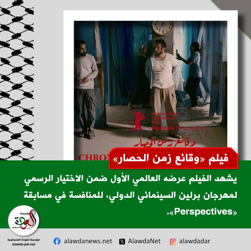 يشهد الفيلم الفلسطينى "وقائع زمن الحصار" عرضه العالمي الأول ضمن الاختيار الرسمي لمهرجان برلين السينمائى الدولي، للمنافسة في مسابقة "Perspectives".