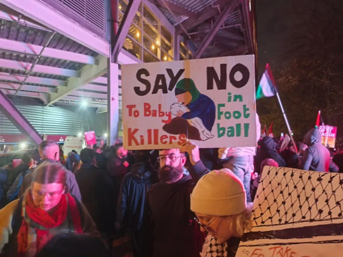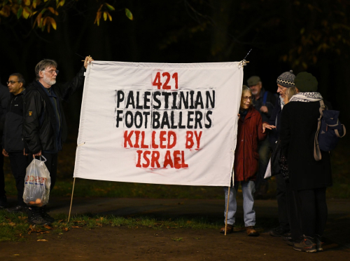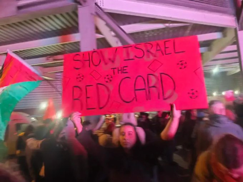 وتحت شعارات مثل "أروا إسرائيل البطاقة الحمراء" و"لا لقتلة الأطفال"، تظاهر المحتجون أمام ملعب فيلا بارك الذي استضاف المباراة بين أستون فيلا ومكابي تل أبيب، رغم نشر نحو 700 عنصر شرطة في محيط المدينة، في إطار إجراءات أمنية غير مسبوقة.