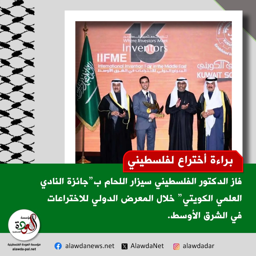 فاز المخترع الفلسطيني سيزار اللحام بإحدى الجوائز الرسمية في النسخة السادسة عشرة من المعرض الدولي للاختراعات في الشرق الأوسط (IIFME 2026)، الذي استضافته دولة الكويت في 12 شباط/فبراير الجاري، بتنظيم من نادي الكويت العلمي.