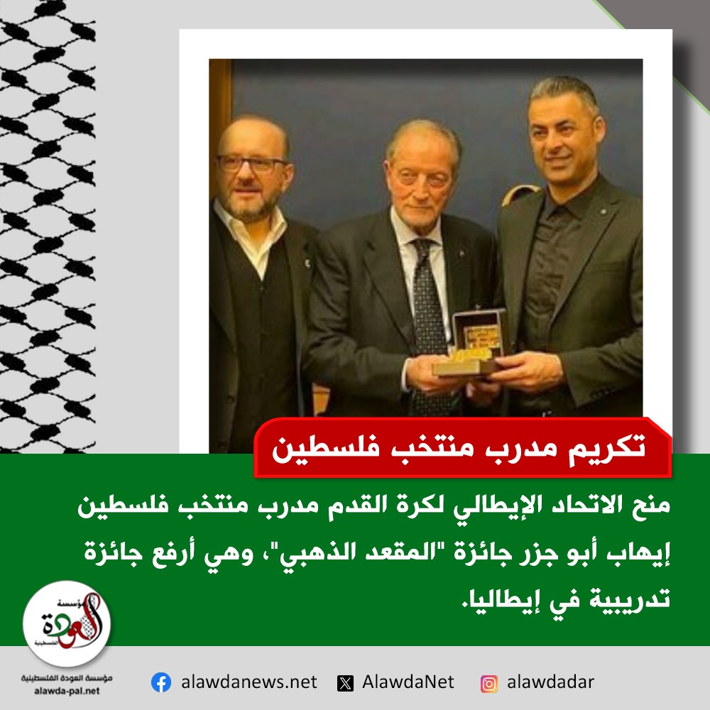 منح الاتحاد الإيطالي لكرة القدم المدير الفني للمنتخب الفلسطيني إيهاب أبو جازار جائزة “المقعد الذهبي” المرموقة، وهي أرفع جائزة تدريبية في كرة القدم الإيطالية، تقديراً لمسيرته التدريبية وإسهاماته في تطوير المنتخب الفلسطيني.