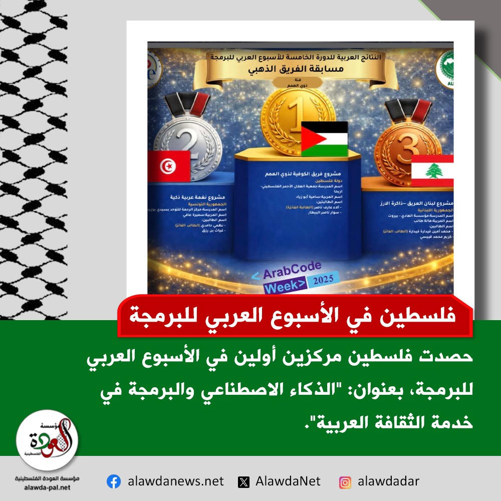 حصدت فلسطين مركزين أولين في الأسبوع العربي للبرمجة بدورته الخامسة، الذي نظمته المنظمة العربية للتربية والثقافة والعلوم (الألكسو) تحت عنوان: "الذكاء الاصطناعي والبرمجة في خدمة الثقافة العربية".