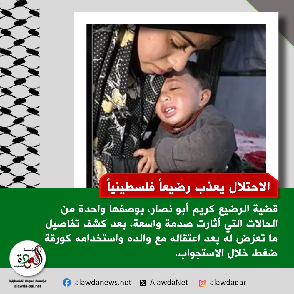 تتفاعل قضية الرضيع كريم أبو نصار، من مخيم المغازي وسط قطاع غزة، بوصفها واحدة من الحالات التي أثارت صدمة واسعة، بعد كشف تفاصيل ما تعرّض له خلال فترة احتجازه مع والده. وبحسب إفادات العائلة، فقد جرى احتجاز الطفل إلى جانب والده في ظروف قاسية، قبل أن يُعاد لاحقاً وهو في حالة صحية متدهورة، ما استدعى نقله لتلقي العلاج.