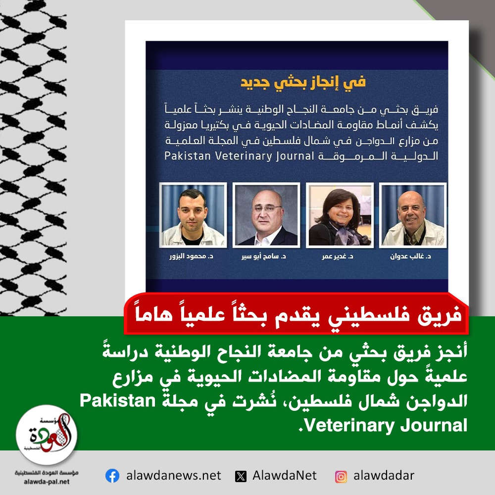 أنجز فريق بحثي من جامعة النجاح الوطنية دراسةً علميةً حول مقاومة المضادات الحيوية في مزارع الدواجن شمال فلسطين، نُشرت في مجلة Pakistan Veterinary Journal المصنفة ضمن الفئة الأولى عالمياً.