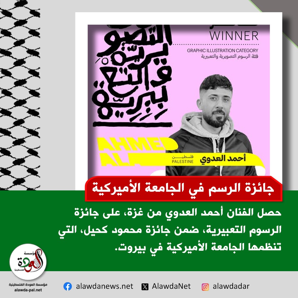 حصل الفنان الفلسطيني أحمد العدوي من قطاع غزة، على جائزة الرسوم التعبيرية، ضمن جائزة محمود كحيل لفنون الشرائط المصورة والكاريكاتور السياسي، التي تنظمها الجامعة الأميركية في بيروت.