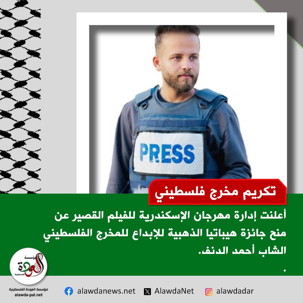 أعلنت إدارة مهرجان الإسكندرية للفيلم القصير عن منح جائزة هيباتيا الذهبية للإبداع للمخرج الفلسطيني الشاب أحمد الدنف، وذلك ضمن فعاليات دورته الثانية عشرة.