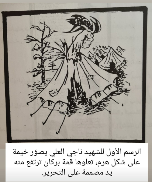 من بين تلك الرسومات برزت "رسمة الخيمة" الشهيرة، التي لم تُنشر بعد ذلك في أي مطبوعة، بل بقيت طيّ الكتمان لعقود، حتى ظهرت لأوّل مرة في كتاب "ناجي العلي: من أجل هذا قتلوني" لمؤلفه محمود عبد الله كلّم، الصادر عن دار بيسان – بيروت، عام 2001.