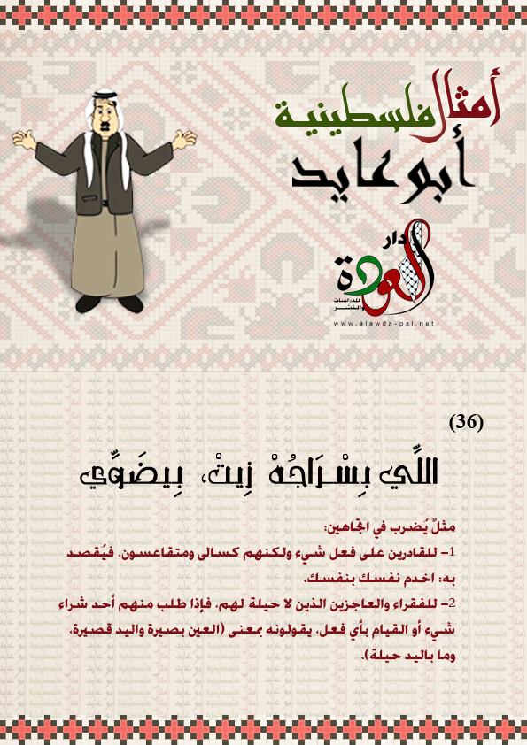 #أمثال_فلسطينية#أبو_عايد(36)اللي بـســــراجـه زيـت، بـيـضـويمثلٌ يُضرب في اتجاهين:1- للقادرين على فعل شيء ولكنهم كسالى ومتقاعسون. فيُقصد به: اخدم نفسك بنفسك.2- للفقراء والعاجزين الذين لا حيلة لهم، فإذا طلب منهم أحد شراء شيء أو القيام بأي فعل، يقولونه بمعنى (العين بصيرة واليد قصيرة، وما باليد حيلة). |