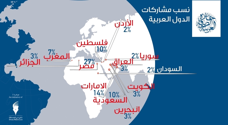 ووصلت عدد المشاركات في الجائزة إلى 5874 عملاً، بمشاركة أكثر من 3 آلاف صحافي وصحافية من 37 دولة حول العالم. واستعراضاً للمؤشرات والنسب الخاصة بالجائزة، فقد جاءت فلسطين بالمرتبة الثالثة بـ597 عملًا أي بنسبة 10%.