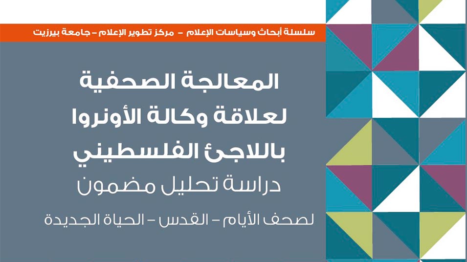 أصدر مركز تطوير الإعلام في جامعة بيرزيت بحثاً جديداً بعنوان "المعالجة الصحفية لعلاقة وكالة الأونروا باللاجئ الفلسطيني"، ضمن دراسة تحليل مضمون لصحف الأيام والقدس والحياة الجديدة.