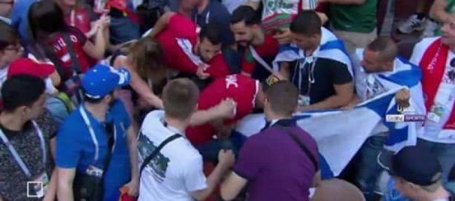 شهدت مدرجات ملعب "لوجنيكي" في العاصمة الروسية موسكو، اشتباك مجموعة من جماهير المغرب مع مشجعٍ كان يرفع علم الاحتلال الإسرائيلي مع نهاية المباراة التي جمعت المنتخب المغربي بنظيره البرتغالي.