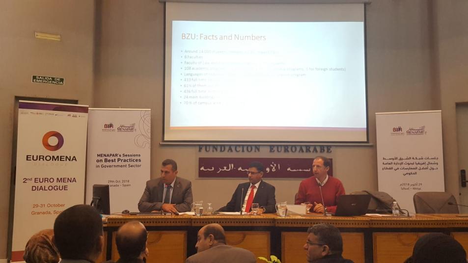 عرض أكاديميان فلسطينيان تجربة التعليم المدمج Participatory Blended Learning المطبقة في برنامج ماجستير الحكومة والحكم المحلي في جامعة بيرزيت، وذلك خلال المؤتمر الثاني للحوار الأورو-متوسطي وشمال إفريقيا حول الإدارة العامة، والذي استضافته جامعة غرناطة في إسبانيا.