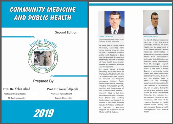 ويحمل الكتاب الذي أعدّه الأكاديميان د. يوسف إبراهيم الجيش عميد كلية التمريض بالجامعة الإسلامية بغزة، و د.يحيى عابد مؤسس كلية الصحة العامة بجامعة القدس-أبو ديس، عنوان "Community Medicine and Public Health".