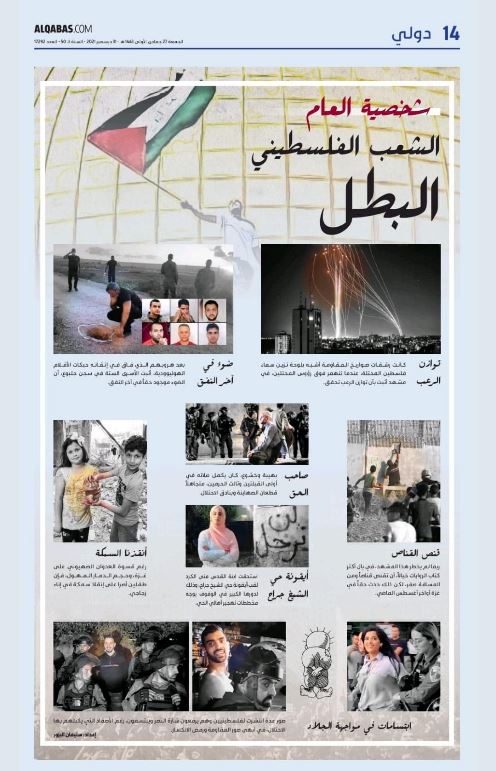 اللافت في الأمر أن شخصية العام ليست شخصاً بعينه، بل هو الشعب الفلسطيني البطل الذي تصدر جريدة "القبس" التي اختارته لهذا العام، نظراً لما قدّم وضحّى من أجل أرضه ووطنه.