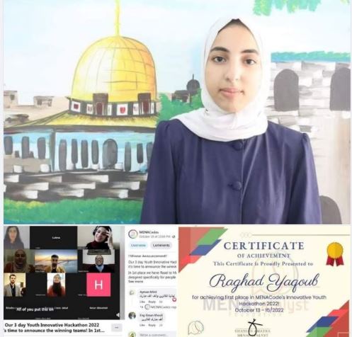 حصدت الطالبة رغد البحيصي من غزة على المركز الأول في مسابقة الهاكثون الرقمي الدولية مع مؤسسة "MENAcodes".