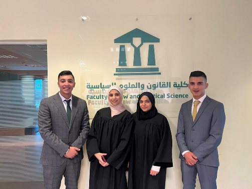 ويتمثل الفريق المشارك من الطالب سعد أبو عيشة والطالبة رهف قنابيطه من تخصص بكالوريوس القانون والطالبة مريم زغلول والطالب محمد نوري من تخصص بكالوريوس رئيسي القانون/ فرعي العلاقات الدولية. بإشراف المدربة أ. بيسان أبتلي، حيث يتحضر الفريق في هذه الأثناء للمشاركة في الجولات الدولية من المسابقة والمنافسة مع مجموعة من الفرق من مختلف الجامعات العربية.