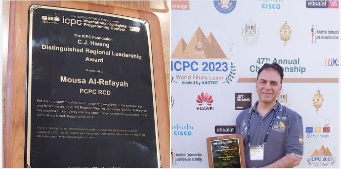 حصل الدكتور الفلسطيني موسى الرفاعية على جائزة التميز الدولية C. J. Hwang" Distngished Leadership Award" بعد تمثيله دولة فلسطين في مسابقة البرمجة الدولية ICPC، والتي عقدت في جمهورية مصر العربية، في الفترة من 14 حتى 19 ابريل الجاري، وذلك بمشاركة 2500 طالب وطالبة يمثلون 300 فريق من 111 دولة بحضور عدد من الوزراء والسفراء من مختلف دول العالم.
