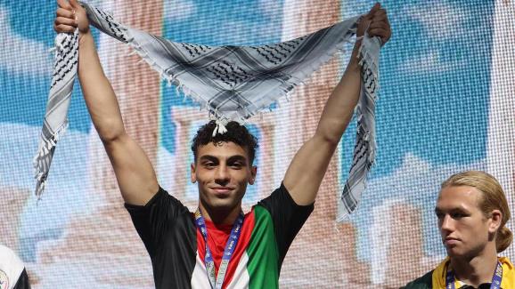 واعتلى العملة منصة التتويج حاملاً الكوفية الفلسطينية كرمز وطني ورسالة سامية بات يجسدها الرياضيون الفلسطينيون في تسليط الضوء على فلسطين وقضيتها العادلة، من خلال منصات التتويج.