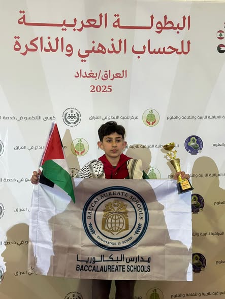 حقق الطالب الفلسطيني محمد أسعد منصور، الممثل الوحيد لفلسطين من مدارس البكالوريا، المركز الثالث في الفئة العمرية 11-12 سنة (Group D) في البطولة العربية للحساب الذهني لعام 2025 التي أقيمت في جامعة بغداد بالعراق.