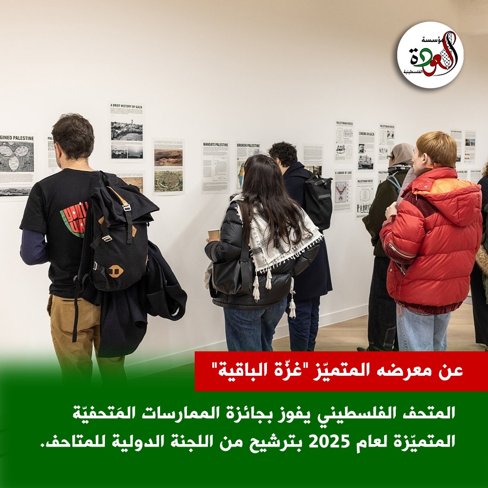 عن معرضه "غزّة الباقية"، فاز المتحف الفلسطيني بجائزة الممارسات المتحفيّة المتميّزة لعام 2025 بترشيحٍ من اللجنة الدوليّة للمتاحف والمجموعات الفنيّة الحديثة.