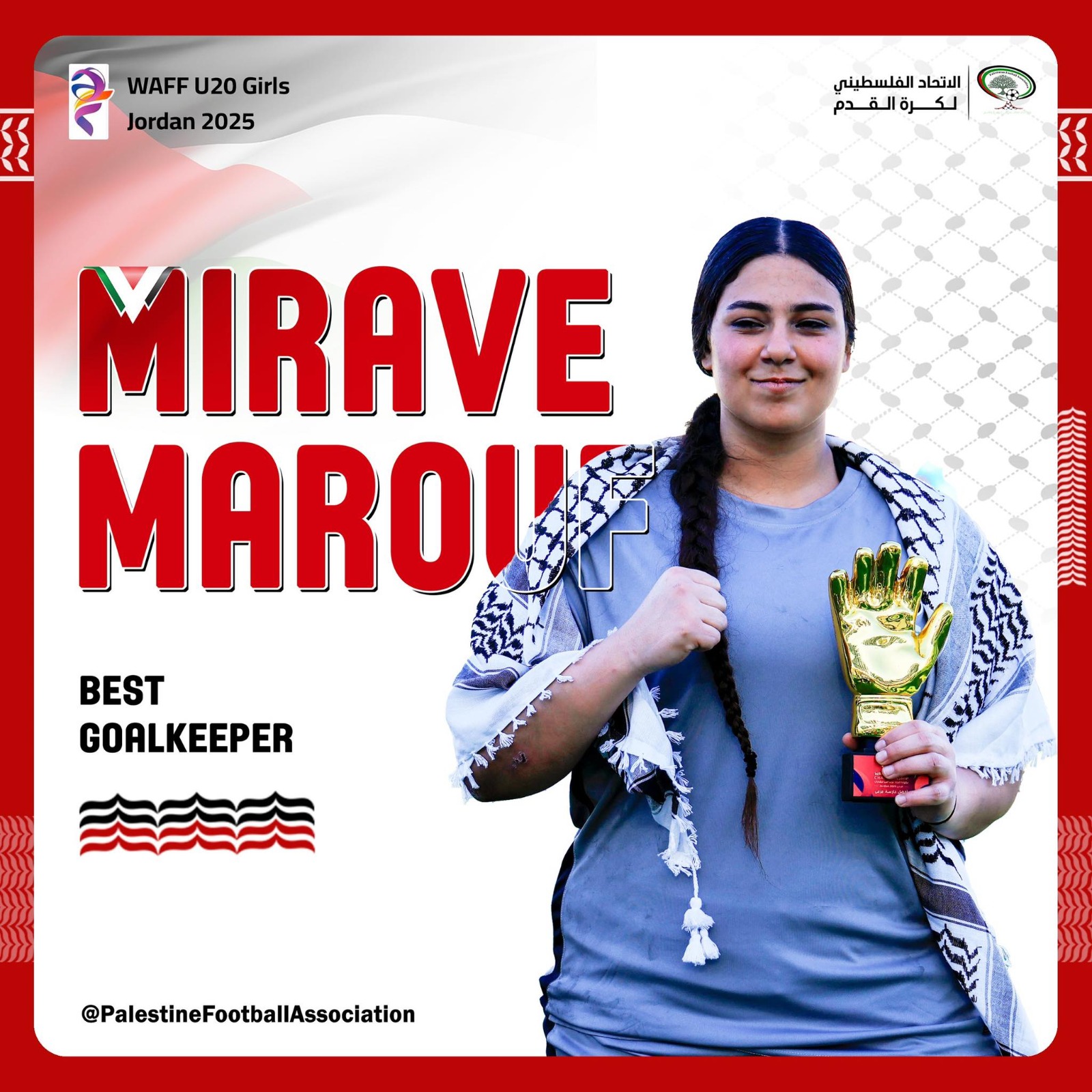 والى جانب هذا الفوز للفريق، حققت اللاعبة الفلسطينية "ميراف معروف" إنجازاً فردياً بتتويجها بجائزة أفضل حارسة مرمى عُقب انتهاء البطولة.