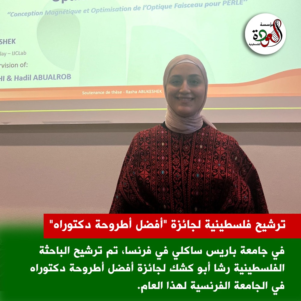 خلال مناقشتها أطروحة الدكتوراه في تخصص فيزياء المسارعات في جامعة باريس ساكلي في فرنسا، تم ترشيح رسالة الباحثة الفلسطينية رشا أبو كشك لجائزة أفضل رسالة دكتوراه في الجامعة الفرنسية لهذا العام.