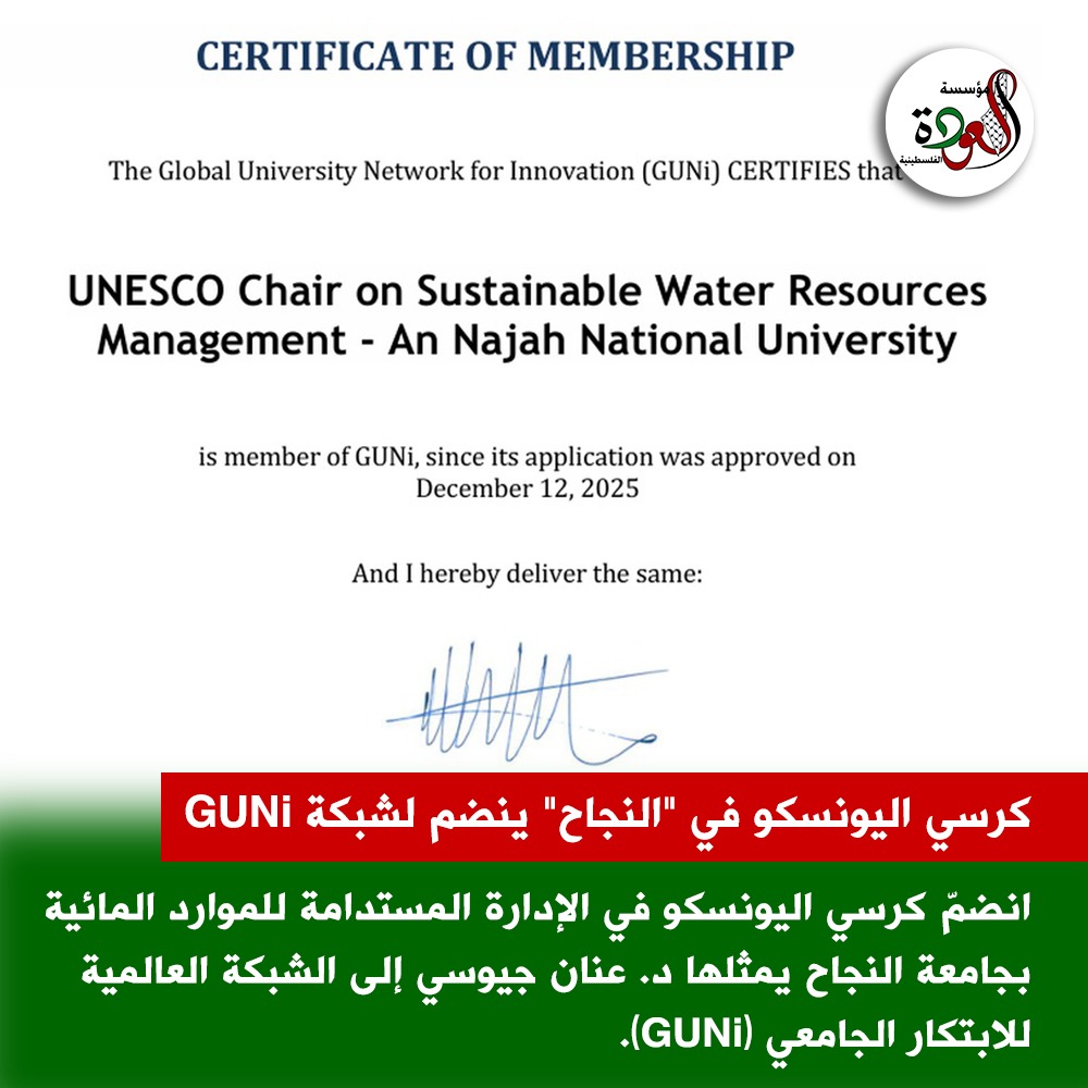 انضمّ كرسي اليونسكو في الإدارة المستدامة للموارد المائية بجامعة النجاح الوطنية الفلسطينية ممثلاً بحامله د. عنان جيوسي كعضو دائم في الشبكة العالمية للابتكار الجامعي (GUNi).