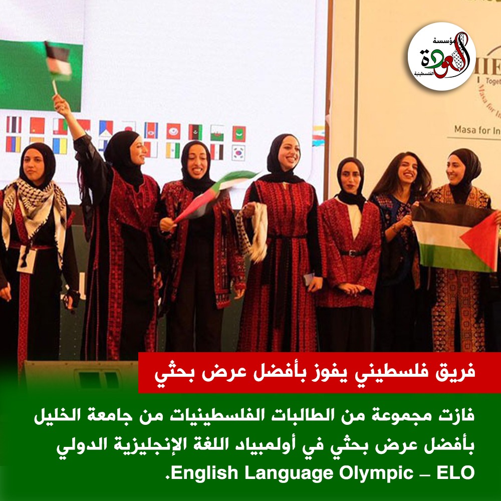 فازت مجموعة من الطالبات الفلسطينيات من جامعة الخليل بأفضل عرض بحثي في أولمبياد اللغة الإنجليزية الدولي English Language Olympic – ELO الذي انطلق في العاصمة الأردنية عمّان.