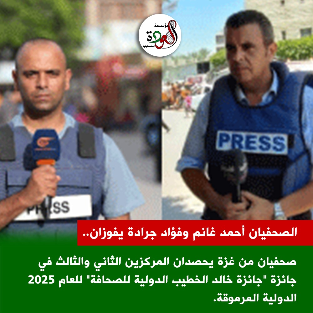 فاز الصحفيان الفلسطينيان أحمد غانم وفؤاد جرادة بالمركزين الثاني والثالث في "جائزة خالد الخطيب الدولية للصحافة" للعام 2025، والتي تُمنح سنوياً لأفضل التغطيات من مناطق النزاع والحروب حول العالم.