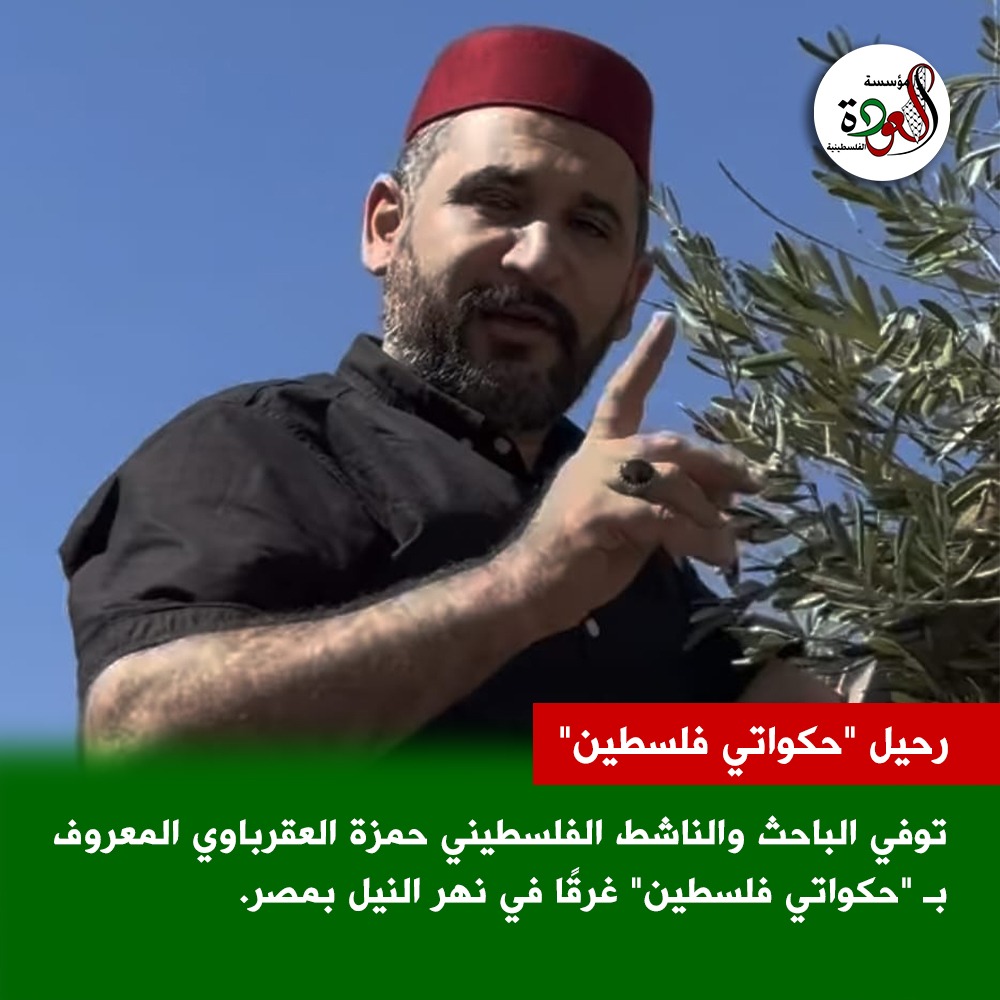غيّب الموت الباحث والراوي الفلسطيني حمزة العقرباوي، المعروف بلقب "حكواتي فلسطين"، إثر حادث غرق في نهر النيل بمصر، في فاجعة ألمّت بمحبي التراث والذاكرة الشعبية الفلسطينية.
