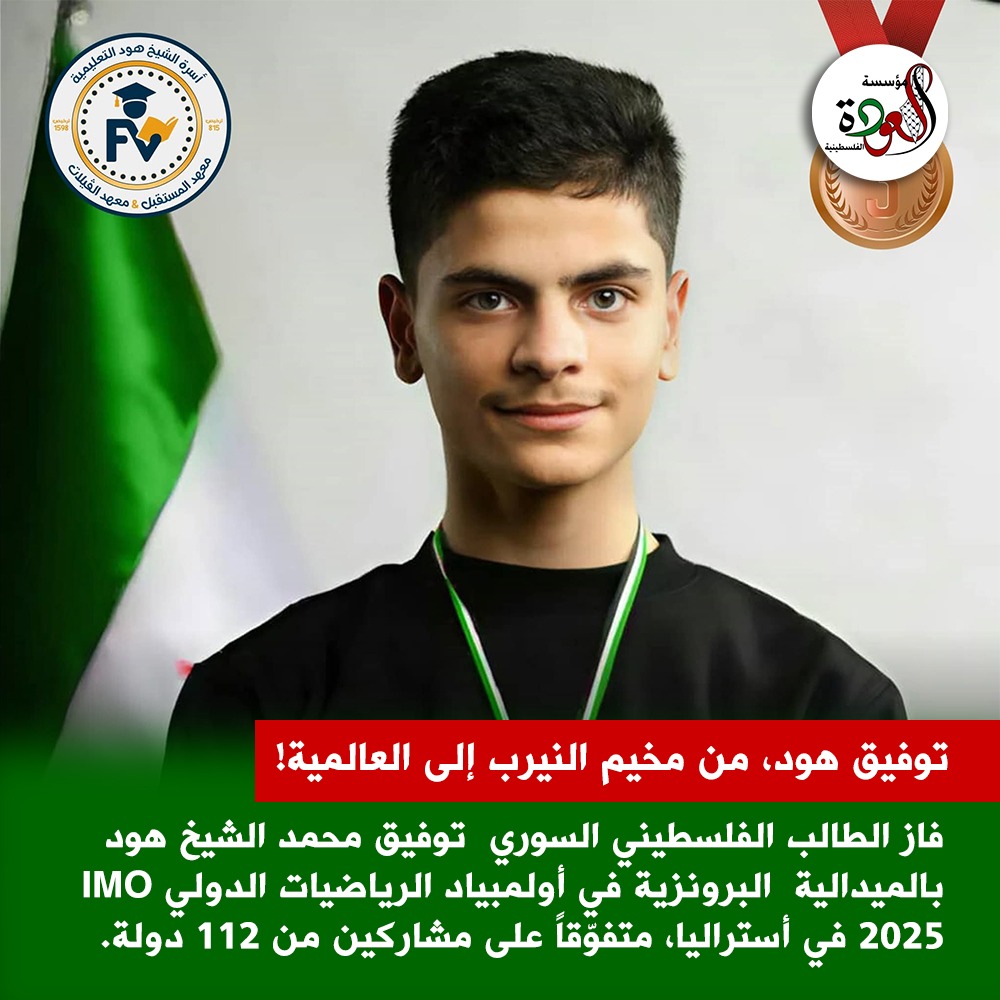 حصد الطالب الفلسطيني السوري توفيق محمد الشيخ هود من مخيم النيرب في حلب الميدالية البرونزية في أولمبياد الرياضيات الدولي (IMO 2025)، الذي استضافته مدينة سانشاين كوست الأسترالية بمشاركة 112 دولة من حول العالم.