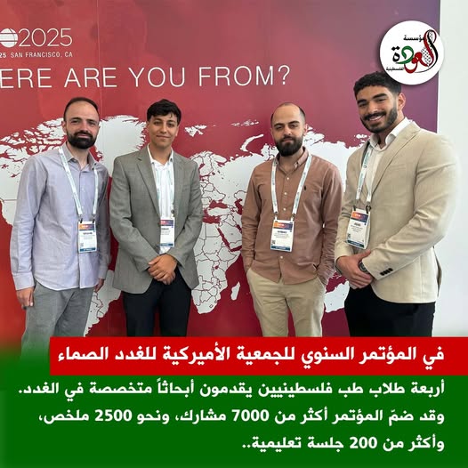 قدّم 4 طلاب طب فلسطينيين أبحاثاً مميزة في مجال الطب خلال مشاركتهم في المؤتمر السنوي للجمعية الأميركية للغدد الصماء "ENDO 2025" العالمي.
