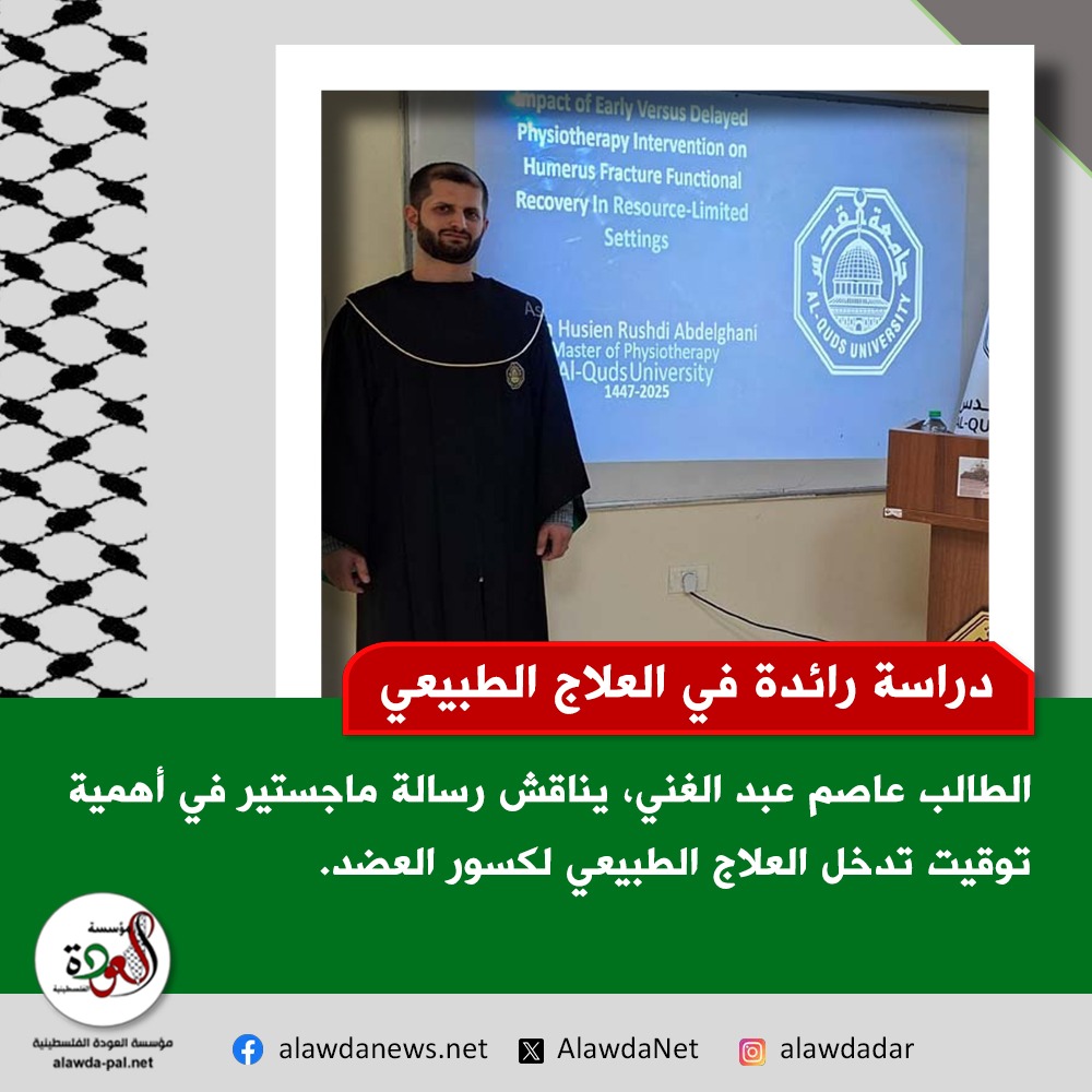 ناقش الطالب عاصم عبد الغني، في برنامج الماجستير للعلاج الطبيعي بجامعة القدس، أول رسالة علمية على مستوى فلسطين تقارن بين التدخل المبكر والمتأخر للعلاج الطبيعي في حالات كسر عظم العضد في البيئات محدودة الموارد.