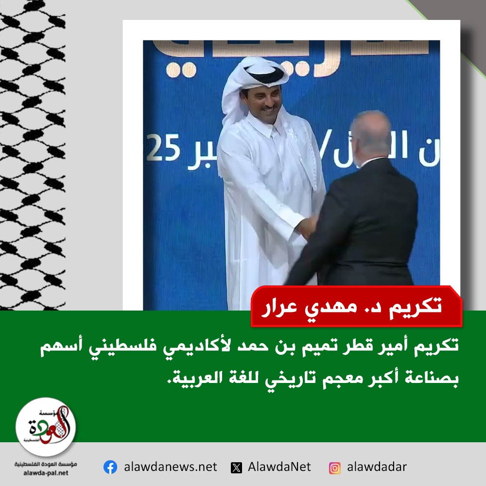 كرّم سموّ الشيخ تميم بن حمد آل ثاني أمير دولة قطر الأكاديمي الفلسطيني د. مهدي عرار، تقديراً لإسهاماته العلمية المحورية في معجم الدوحة التاريخي للغة العربية أحد أكبر المشاريع المعجمية في تاريخ العربية الحديث.