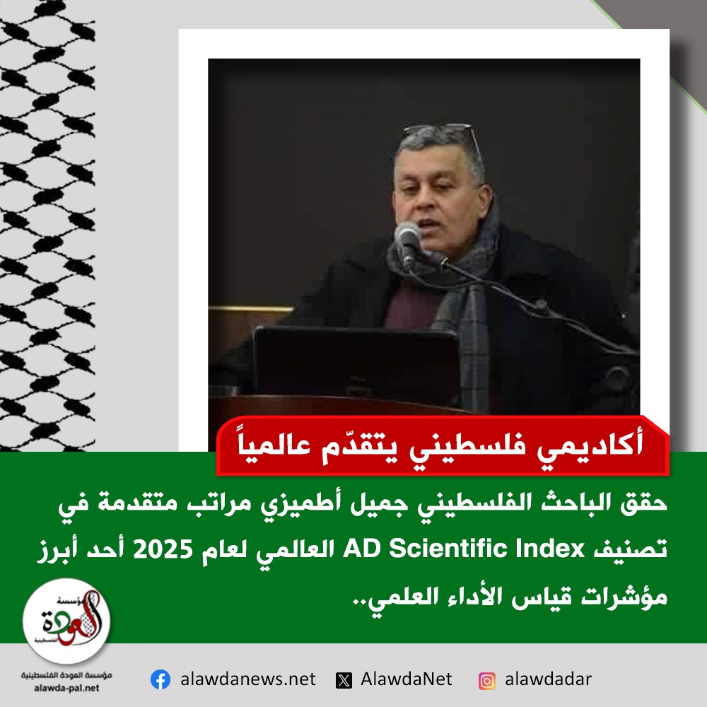 حقق الأكاديمي والباحث الفلسطيني الدكتور جميل اطميزي مراتب متقدمة في تصنيف AD Scientific Index العالمي لعام 2025 أحد أبرز مؤشرات قياس الأداء العلمي للباحثين والمؤسسات الأكاديمية.