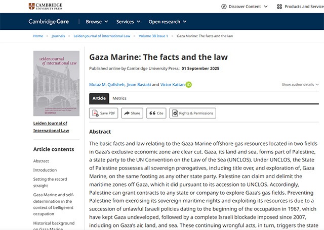 نشر الباحث الفلسطيني د. معتز قفيشة، بحثًا بعنوان "حقول غاز غزة البحرية: الحقائق والقانون" في مجلة لايدن للقانون الدولي الصادرة عن مطبعة جامعة كامبريدج.