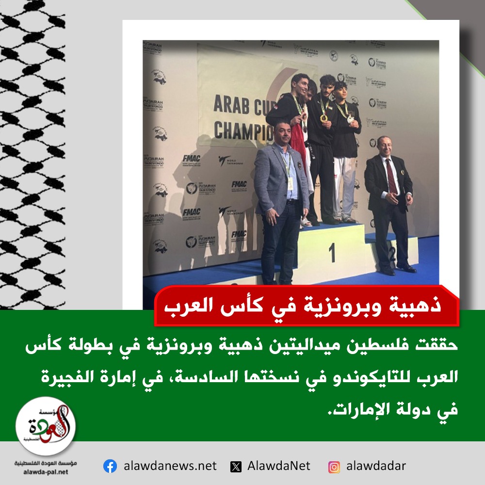 حققت فلسطين ميداليتين ذهبية وبرونزية في بطولة كأس العرب للتايكوندو في نسختها السادسة، والتي تستضيفها إمارة الفجيرة في الإمارات العربية المتحدة.