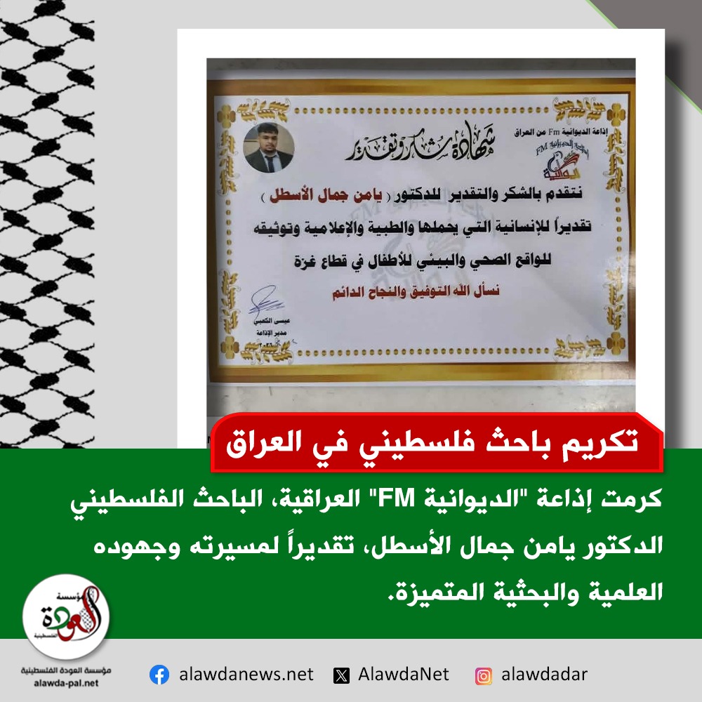 إذاعة "الديوانية FM" العراقية تُكرّم باحث فلسطيني لعطائه العلمي والإنساني